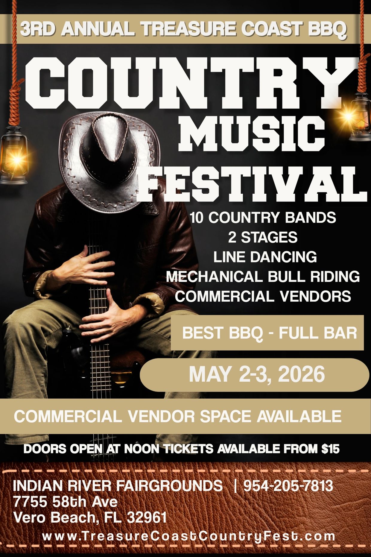 VERO BEACH, FL β The 3rd Annual Treasure Coast Country BBQ & Music Festival is back and better than ever! Scheduled for May 2-3, 2026, at the Indian River Fairgrounds in Vero Beach, this much-anticipated event is now accepting applications from BBQ, Arts & Crafts, commercial vendors and country bands. Donβt miss your chance to be part of one of Floridaβs most exciting celebrations of country music, barbecue, and community spirit!