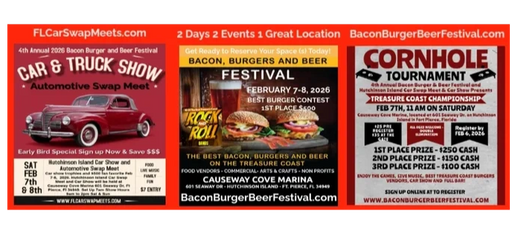 Vendors Wanted 4th Annual 2026 Bacon Burger & Beer Festival February 7-8, 2026 Food Vendors, Arts Craft and Retail Vendors, Games & Attractions, Small Business & Community Organisations, Car Show & Auto Swap Meet. Causeway Cove Marina 601 Seaway Dr., Hutchinson Island, Ft Pierce FL
